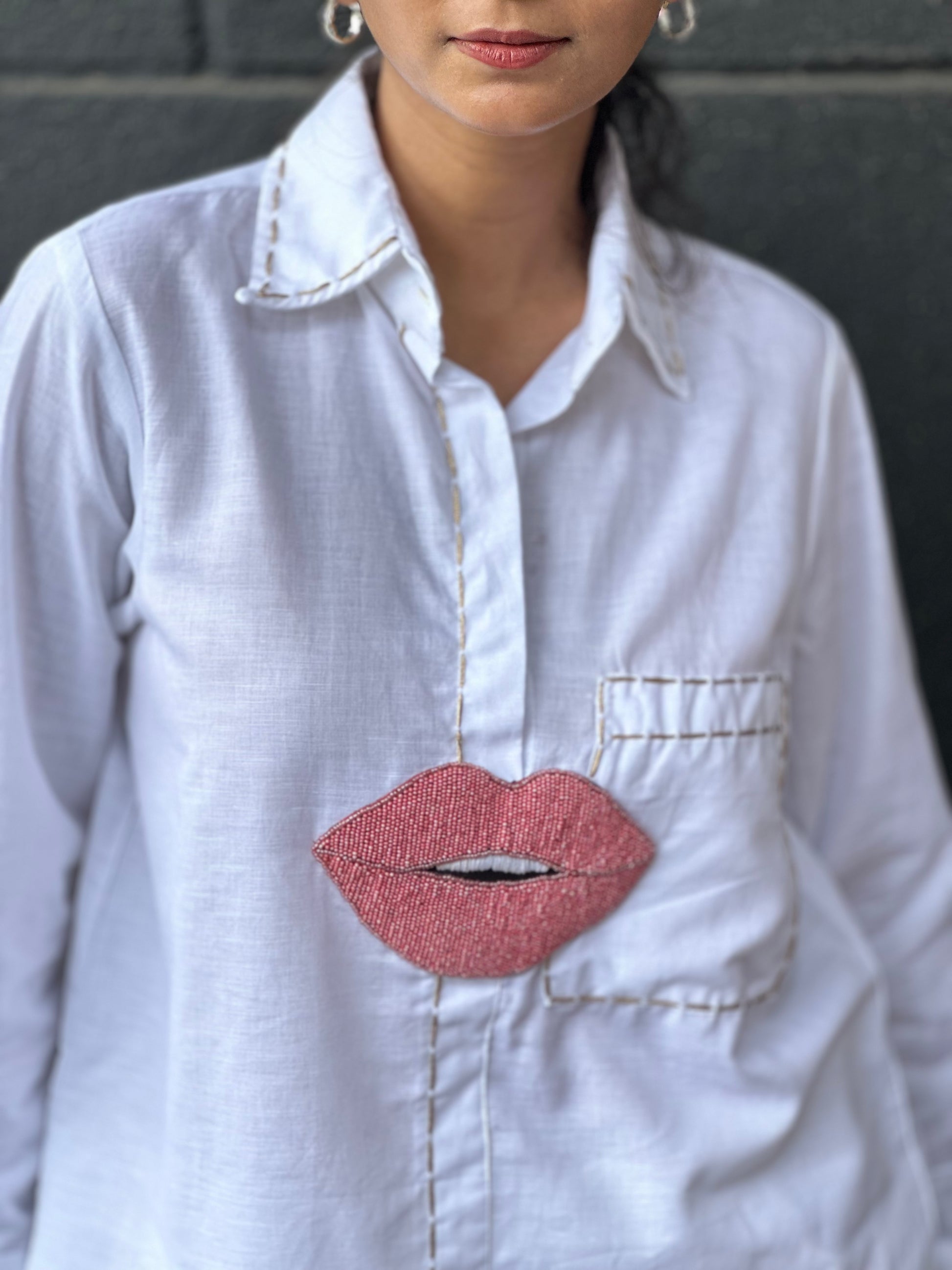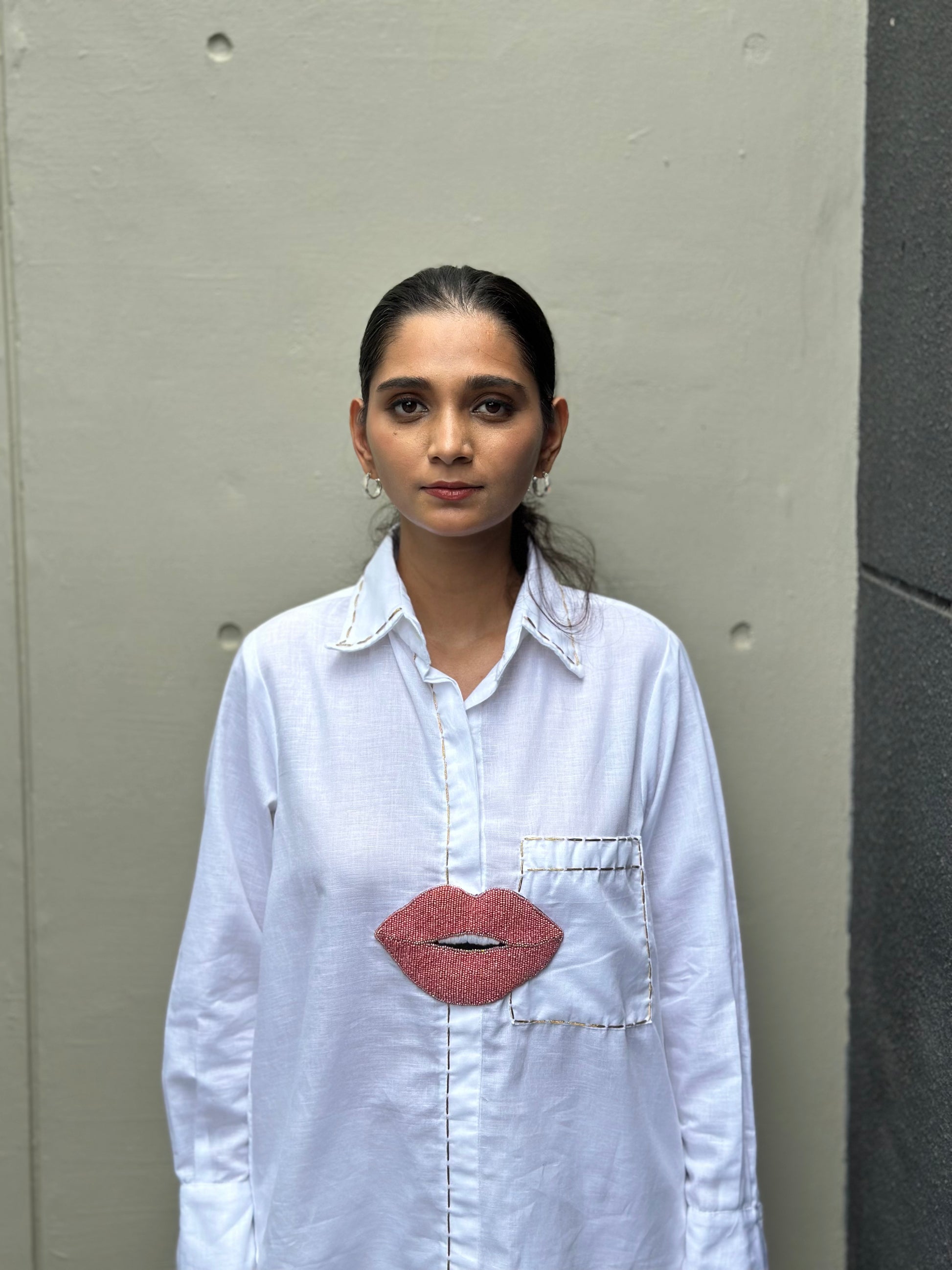 White linen shirt with an embroidered lip motif and silk thread details on the pocket, placket and cuffs